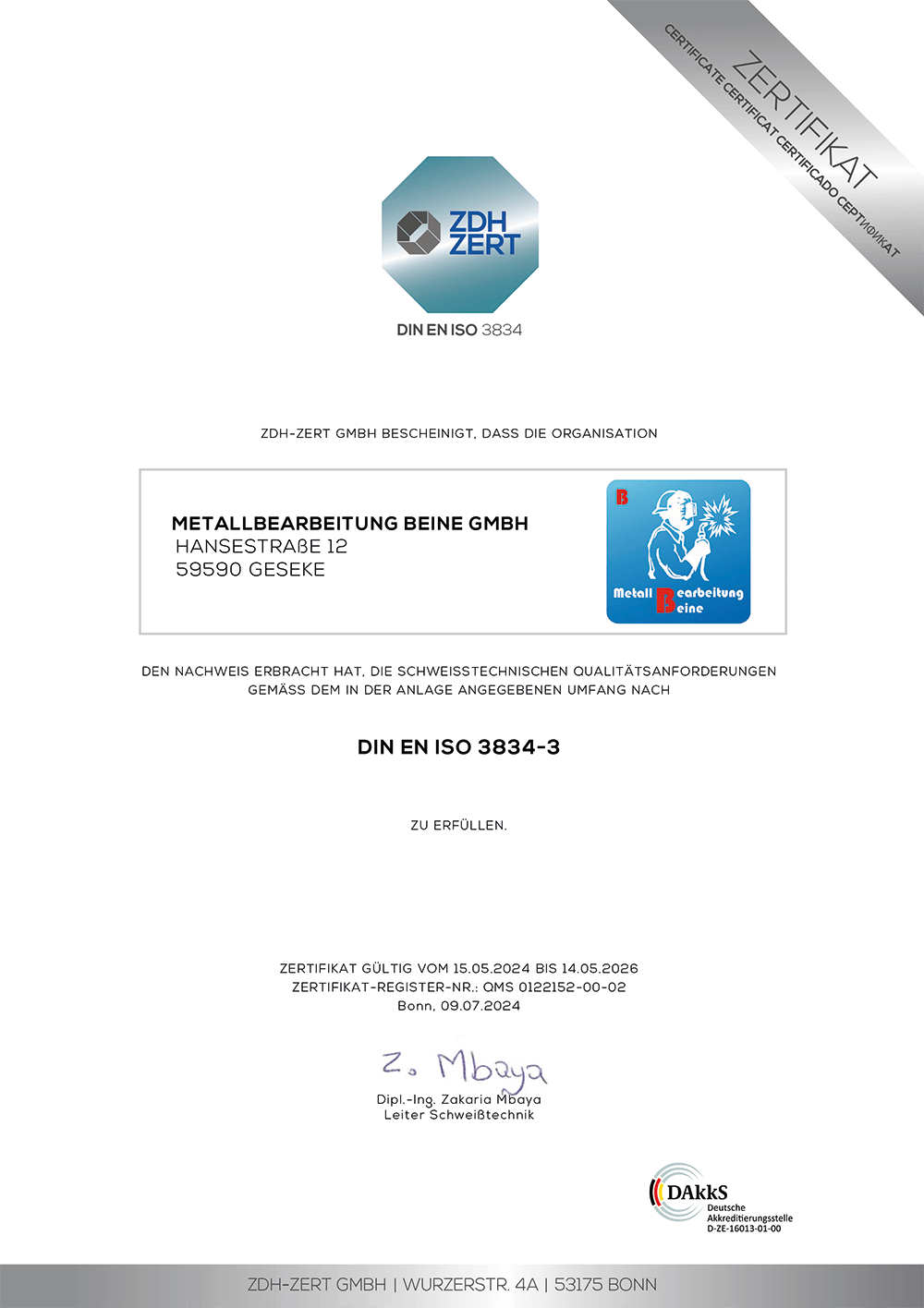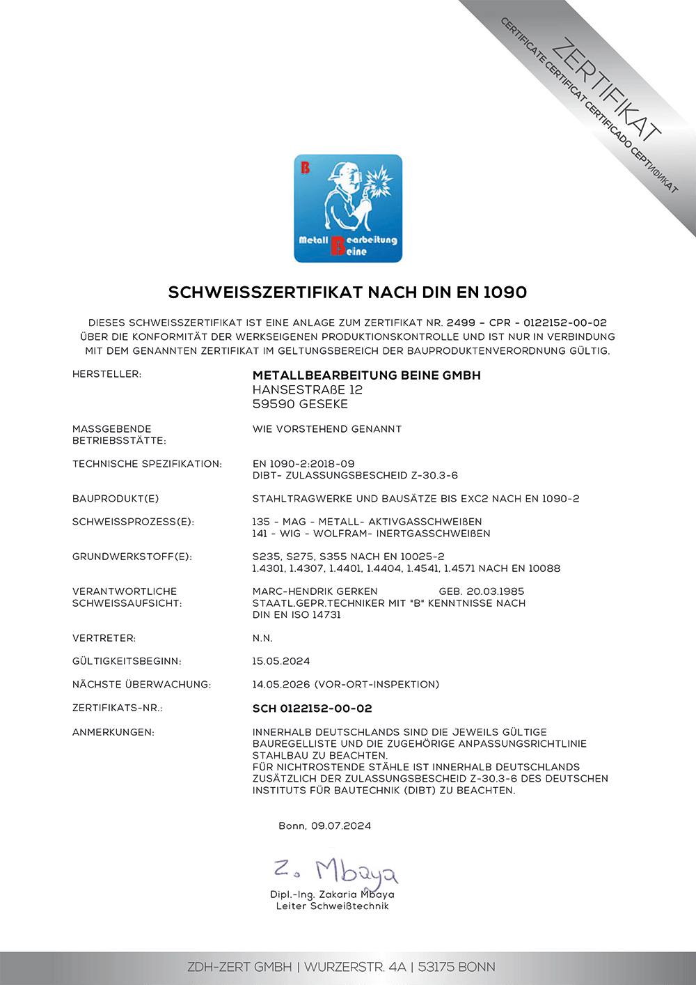 At Metallbearbeitung Beine, we uphold the highest standards. Our production is certified according to DIN EN ISO 9001 demonstrating excellent quality management. In addition, we meet the requirements of DIN EN 1090 (welding certification) and DIN EN ISO 3834 for verified welding processes. Compliance with production control (WPK) ensures the safety and reliability of all manufacturing processes. Certified quality you can trust!
